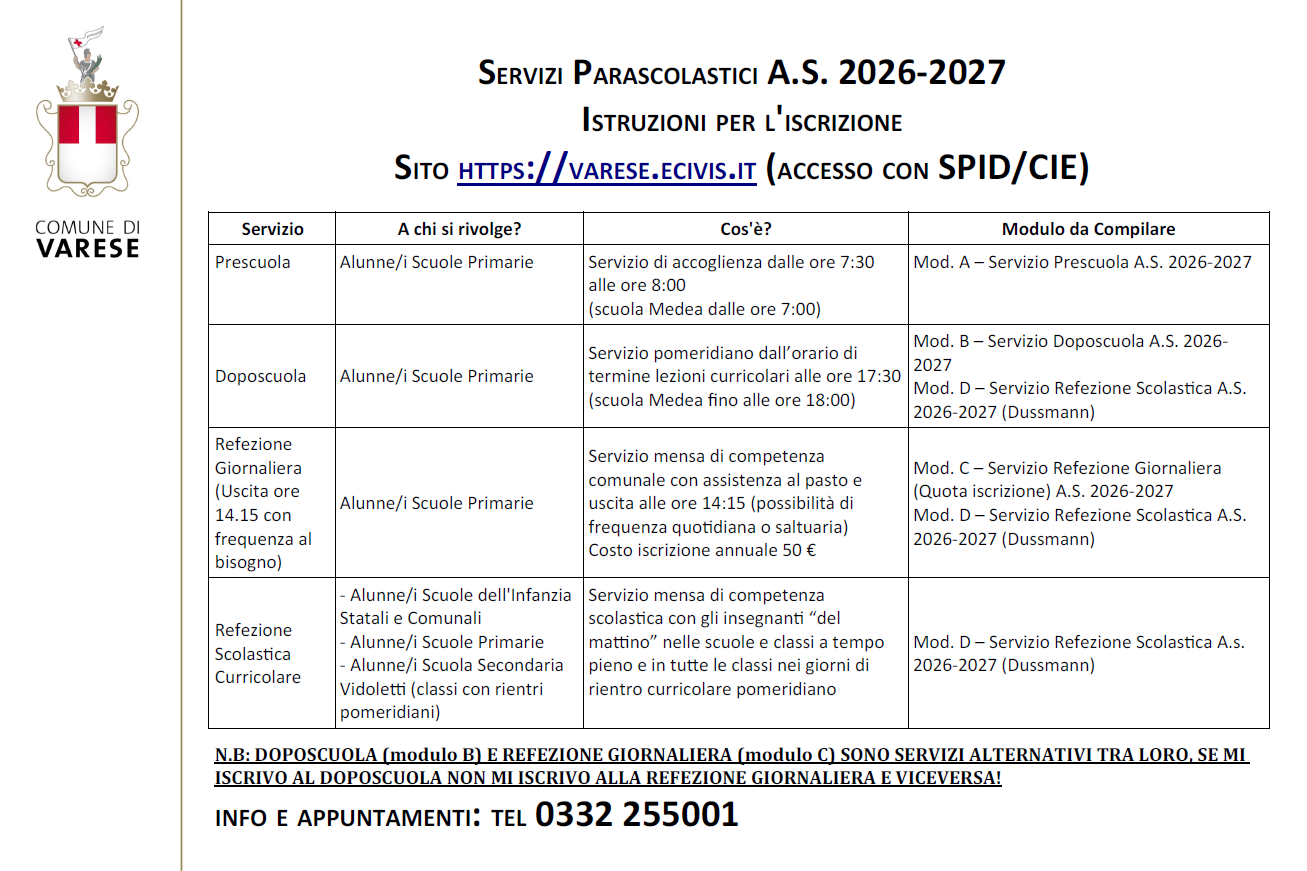 ISCRIZIONI SERVIZI PARASCOLASTICI Comune di Varese A.S. 2026-27: dal 13/04/2026 al 18/05/2026